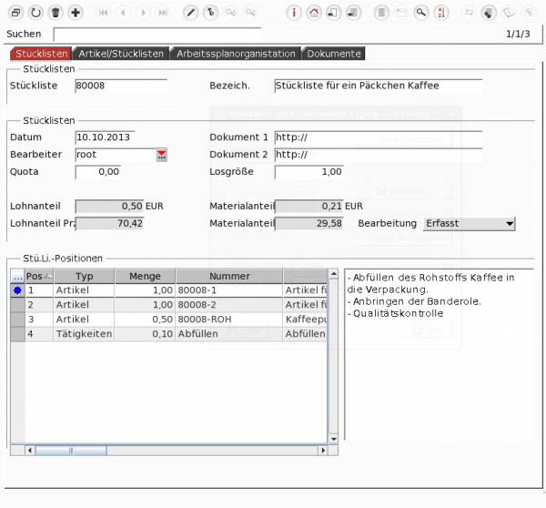 Die Stückliste ist die Grundlage eine Produktionsprozesses. Die Artikelpositionen werden im Warenbestand bewegt und die Tätigkeit wird vom externe Veredelungsunternehmen durchgeführt. Somit muss ein Veredelungsauftrag mindestens einen Artikel und eine Tätigkeit beinhalten.